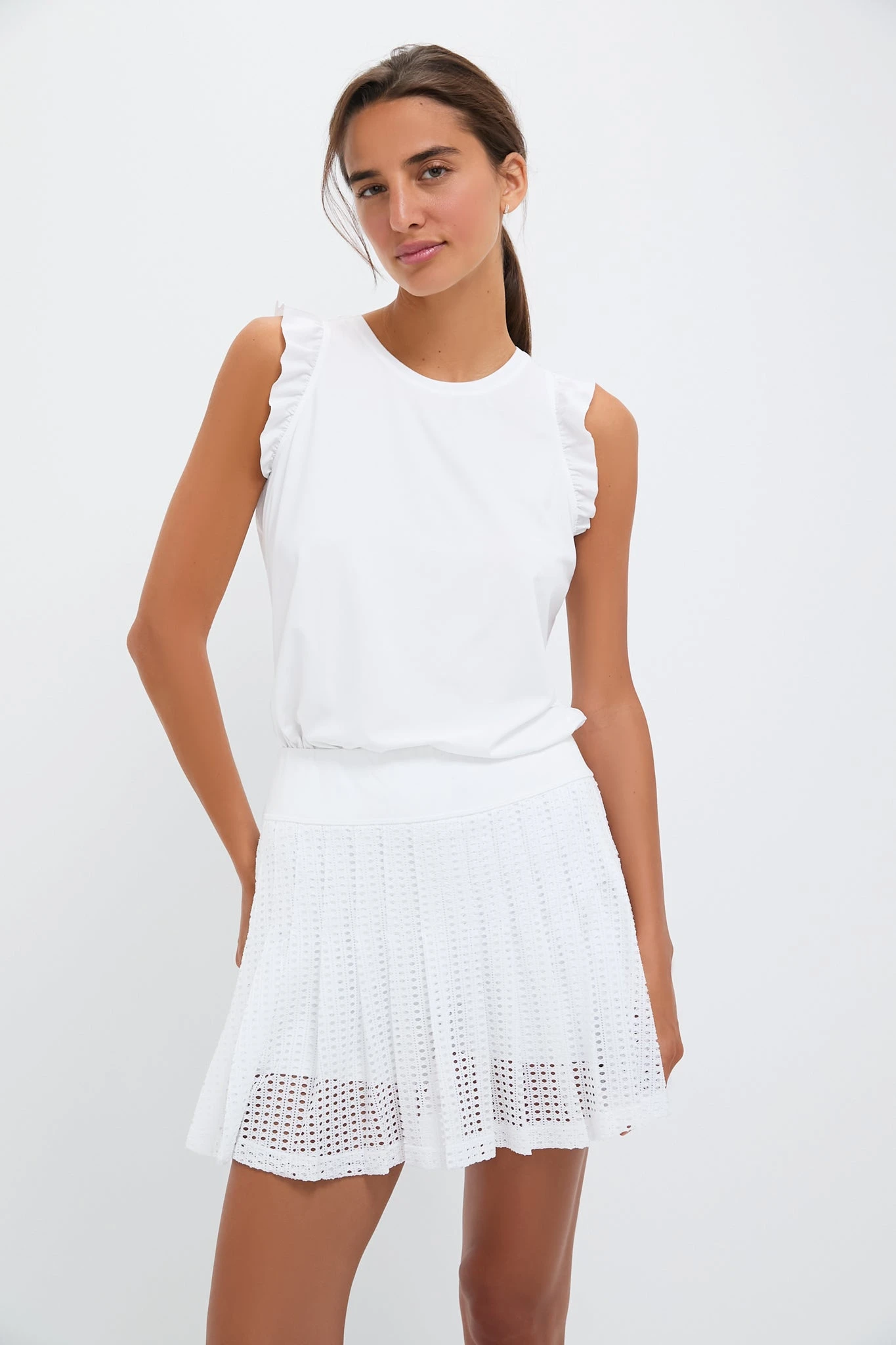 The White Ruffle Lea Tank can seamlessly take you from court to cocktails with its performance-technology fabric and feminine sleeve detailing! Pair with a tennis skirt and cardigan for a chic athleisure look.